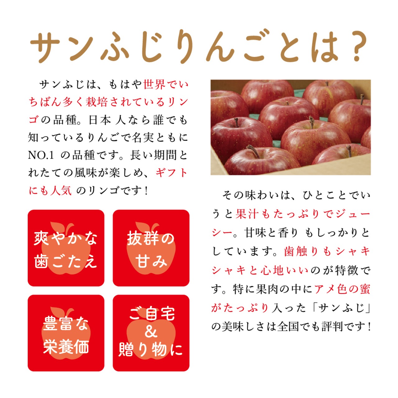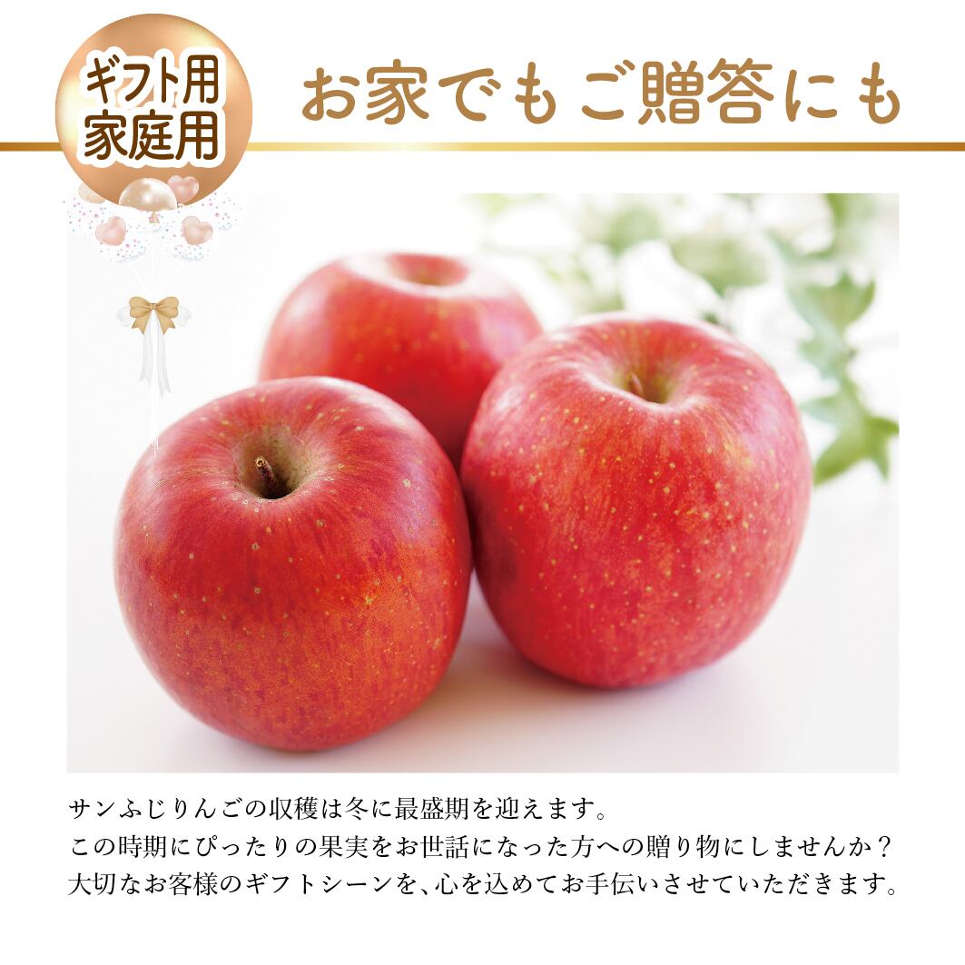 この「サンふじりんご」は長年の研究と農家さんの手間暇をかけて栽培されています。安心・安全な農薬を使用し、愛情を注いで育てられたりんごです。丹精込めて育てられたその姿をぜひイメージしながらお召し上がりください。